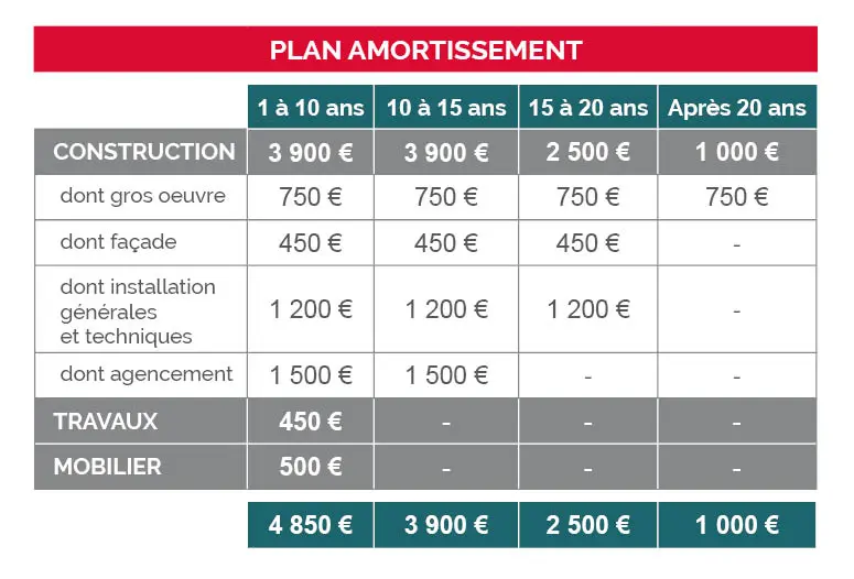 Sur le plan d’amortissement, on observe que sur les 10 premières années j’aurais un amortissement de 4850€ par an, puis à partir de la 10ème 3900€. Les amortissements sont moins importants à partir de la 10ème année car les meubles et les travaux sont amortis sur 10 ans.